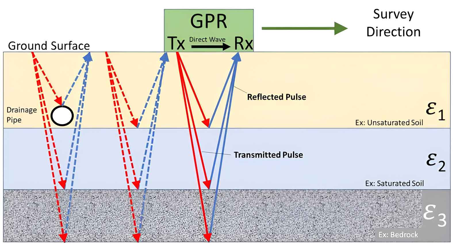 Schematic diagram of a GPR survey.  Reflected waves penetrating the subsurface travel at different velocities based on the dielectric permittivity (ε) of the media in which they encounter.  All subsurface anomalies, such as the draining pipe, are observed by the GPR.  The progression of the survey is represented by dashed lines. (source Brett Trottier, USGS)